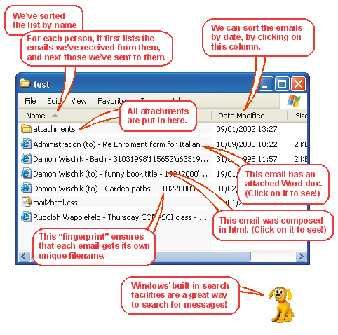 Here are some messages from my own personal email archive. Click on a message to see how it looks, now that Email Archiver has converted it. (Some confidential details have been deleted. And obviously, when you use Email Archiver yourself, you certainly don't have to put your archives on the Internet as I have done here!)