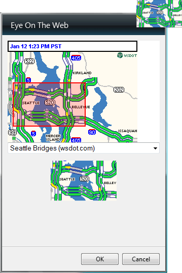 Eye On The WebThis is a gadget for the Windows Vista sidebar. It embeds a snippet of any webpage you like into the sidebar. It comes with some suggestions -- Seattle traffic maps and weather, news headlines from BBC, a webcam of Times Square -- but it's more fun to point it at your own favourite webpage. Use its handy drag-and-resize interface (the red rectangle in the picture) to let you chose which bit of the webpage you want to appear in your sidebar.