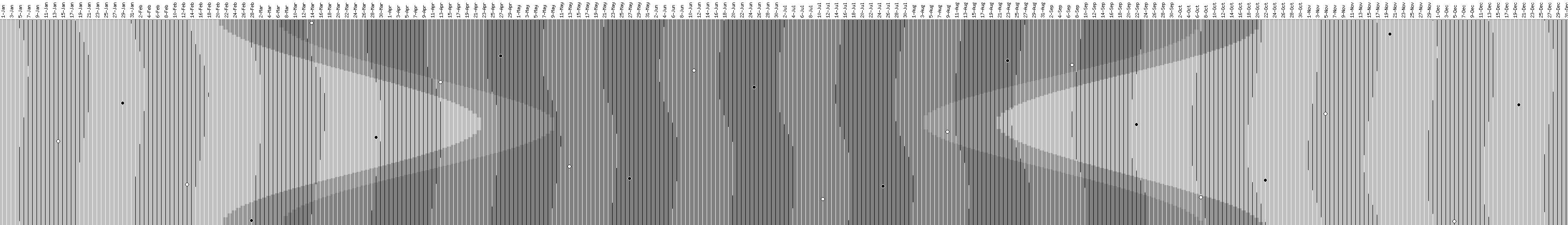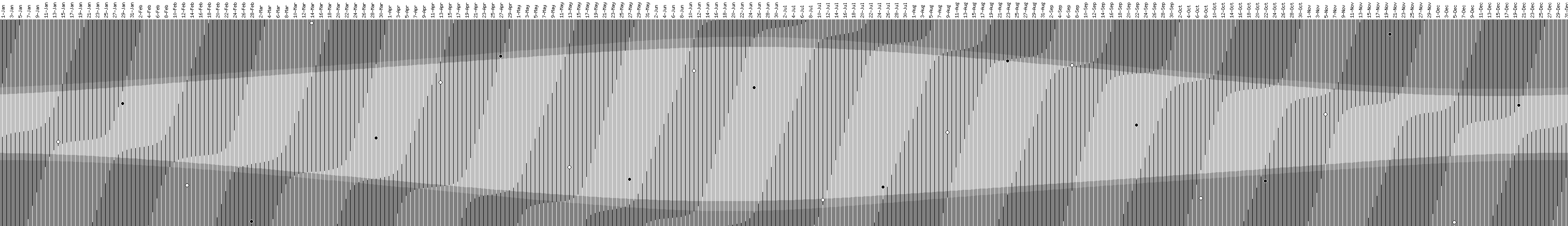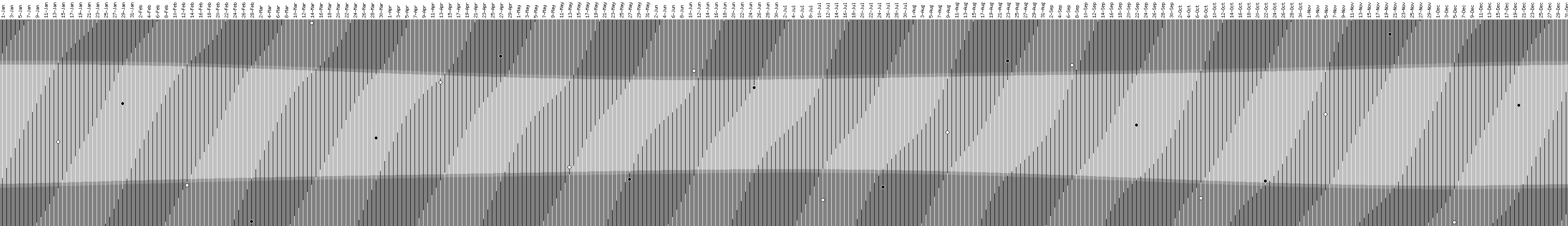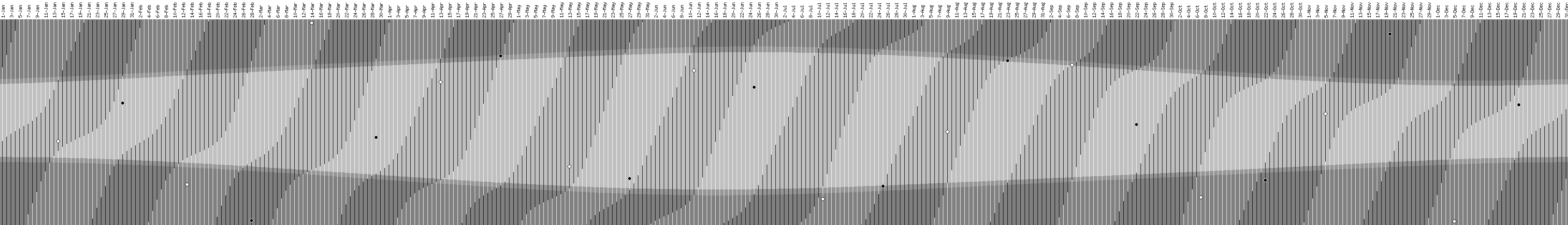 The year runs from left to right. Each day goes from bottom to top. The broad sweep of light and dark show the sun. See how Vostock Base in the Antarctic has a whole week at the start of May where there is a sort of twlight, but the sun never even makes it above the horizon. The narrower bands show when during the day the moon is above the horizon. This is not the same as phases of the moon; they are shown with small dots.