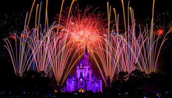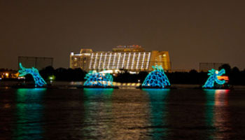 But at night a giant sea monster lumbered out of the lake to attack. It was lit up by rage. The resort staff managed to scare it off with fireworks from the Disney Castle, but each night the monster renewed its assult; I think it's only a matter of time before it sees through the fireworks trick and the resort has to be evacuated.