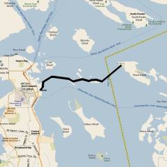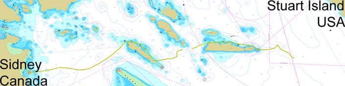 PLAN: Depart from Stuart Island State Park on the northwestern tip of Stuart Island. Swim to Sidney on Vancouver Island. This will be a demanding swim due to the strength of the currents. The straight-line distance is 9 miles, but it will feel like 10.5 miles due to the currents. Canadian Customs and Immigration said that it's fine to arrive as a swimmer at the customs post in the marina. Tell them that we have an accompanying sailboat, and sign in together. This is a cross-border swim so passports are required. Also, you're not allowed to set foot on Canadian territory until after signing in, so no stopping at the islands along the way.