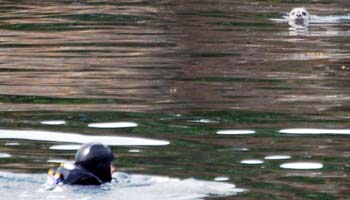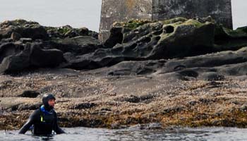 It was hard! Fighting the currents took a fifth of my effort, and my buoyancy took another fifth (it was so cold I couldn't sustain head-under-water swimming). For almost the whole duration of the swim I didn't believe I would make it. I took my first break in the water by Rum Island with some cute seal pups for company, and took a gulp on my inhaler and some chocolate. I'd planned to make this a largely unsupported swim, i.e. I would carry everything on my back, and only refill it at the midpoint.