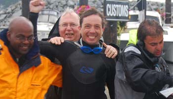 Garrett kept marine radio contact with passing boats to make sure they stayed clear. I made it onto the customs dock at 6:48pm -- that was 9h37 after first entering the water, and after 7h50 of solid swimming 7.5 miles. I went to the customs phone and said "I'd like to report that I've arrived in Canada". The customs official asked on what boat I'd sailed in. I said "myself", in that I swam. The official said "What?! Um, wait one moment, I have to speak with my superior..." !