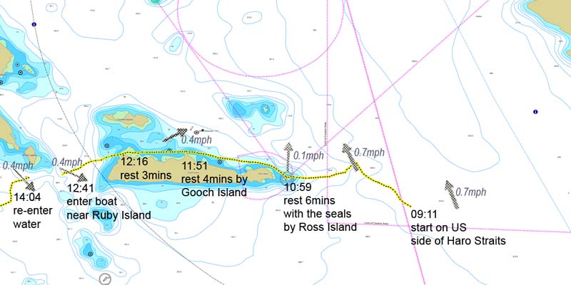 We anchored in Roche Harbor the night before. I got up at 4am to sail the boat in the dark to Stuart Island, ready to start the swim at 5:30am. That's when the tides would work out. Unfortunately at 5am the boat's engine cut out. It took us four hours to find and repair the fault -- seaweed in the impeller. By this time the currents made it impossible to start from Stuart Island, so instead I picked a start point in the US waters which the currents would allow. I got into the water at 9:11am.