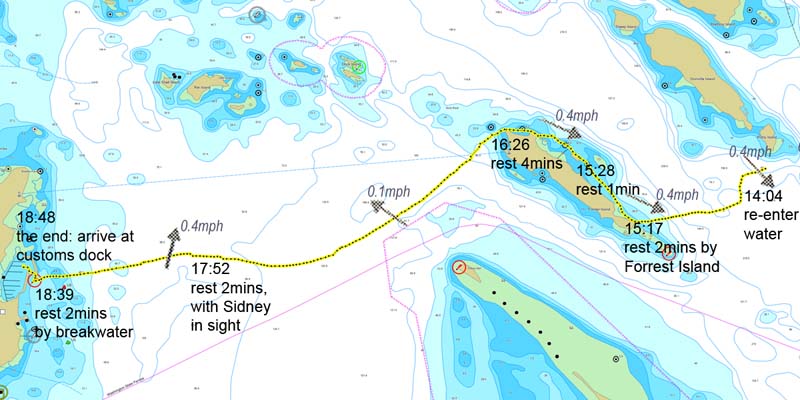 The final leg was cold. As soon as the sun went down (7.45pm) I started to get cold, and I got steadily colder until the end. Also my left knee packed in at about 8pm with two hours still to go. The graph above shows air temperature and water temperature. I think that air temperature and water temperature alone aren't a good guide: the warmth and light of the sun was also important. With the cold I felt a sort of weakness throughout my whole body, the same sort of weakness as when you have a flu. But with my cellphone not working due to water damage, I had to rendezvous at the pre-arranged time and place, so had no option but to go on. I distracted myself with my SwiMP3, and with thoughts of steak and crepes.