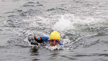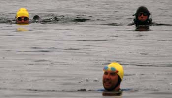 The water was cold and my rest stops became briefer and briefer: I needed activity to stay warm, despite thick two thermal tops under my 3:5mm wetsuit and thermal leggings and gloves and boots and a thick swim-cap under my hood. I took my planned midway break half an hour early, and it took me an hour and a half inside the sailboat to recover from hypothermia and regain some strength. Hot sweet milky tea and soup!